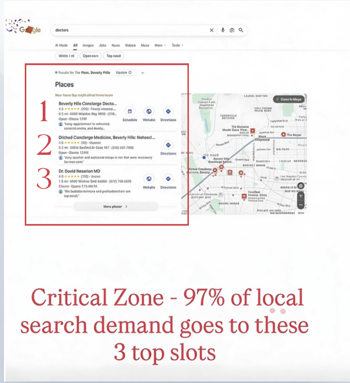 Many small businesses are still investing heavily in the wrong digital infrastructure. They continue to optimize websites, build blogs, and purchase advertising designed to drive traffic that potential customers are unlikely to visit simply because no matter how optimized they get with traditional SEO, they’ll never rank highly enough to displace meaningful traffic from Google’s top listings (that Critical Zone of top 3 Google Business profile listings).