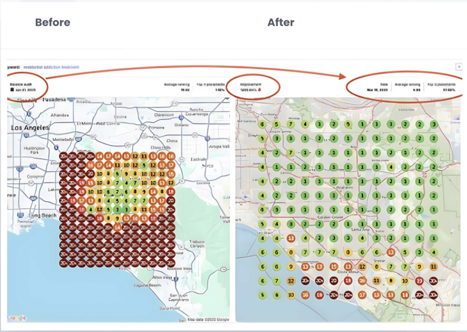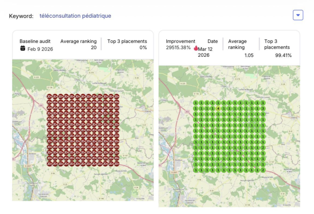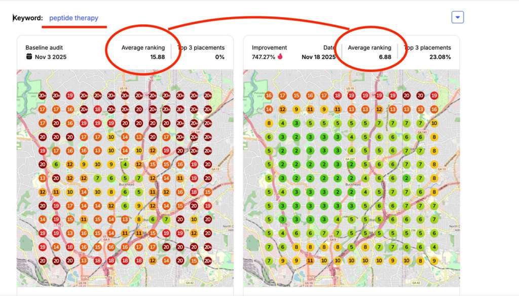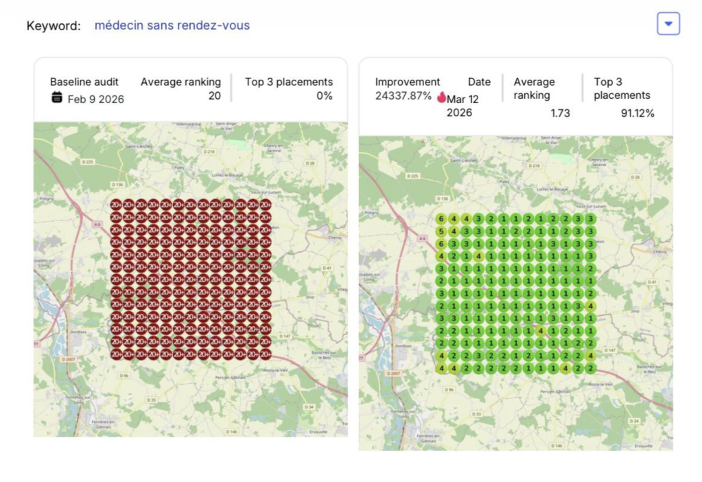 As a result, most Rank and Radius clients quickly (within 1-2 months) start to rank in that critical zone, higher than 99% of competitors for their every service/product across their every serviceable area. As you can see below, within just 45 days, Rank and Radius clients like Fit 9 Atlanta, Recovery Beach Orange County, and Tessan France have gone from being largely invisible for most local search demand to capturing most of the local demand (60%+) for what they sell through their Google Business profile.